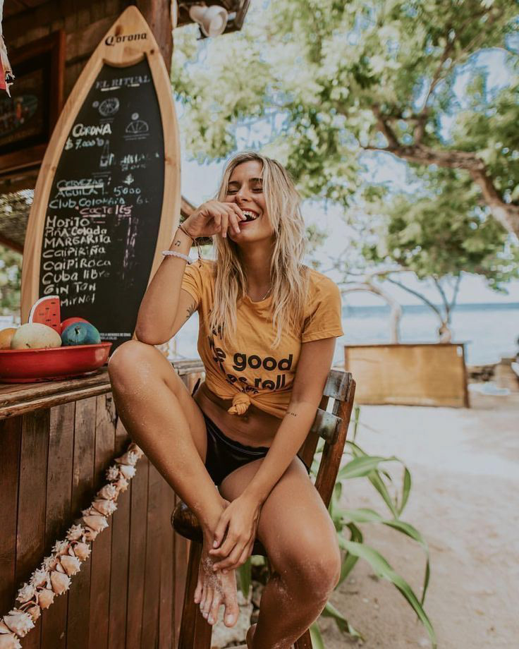 1st look- Casual island wear, model's choice. Look can include board shorts, cutoffs, halters tops, graphic Tee's, sundress etc.